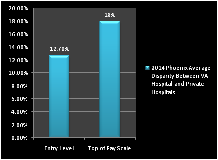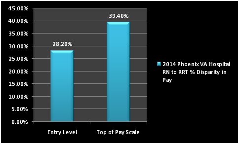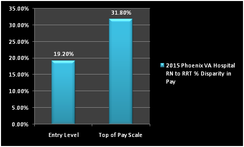 Now we will look at the disparities in pay between respiratory therapists only, private sector verses the public sector (VA).On a national level, the disparity in pay between the government (VA) and the private sector as far as retainment compensation or the top of the pay scale there remains a 16% disparity in pay. In the state of Arizona as a comparison the disparity in pay at the top of the pay scale between government (VA) and the private sector still remains at the 18% level. Many other states are probably in a similar situation but I did not look in depth in each state. The VA has, in my opinion, other than flat out ignoring the situation deliberately, or being completely ignorant in general, has intentionally not kept pace with the private sectors pay scale for respiratory therapists, ever. Recently the VA has acknowledged this great disparity and they are somewhat resolving the issue by utilizing a specialty pay scale to correct the current pay. This is only being addressed now due to the recent agitation from the staff therapists at the VA hospital in Phoenix Az. Guaranteed, if we remained silent, this would have never been addressed. Even with resent increases in compensation locally in the Phoenix area, the disparity in pay between the state of Arizona and the national level for many respiratory therapists, I believe, is still at a great imbalance.