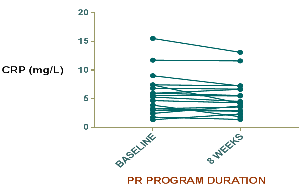 CRP reflects total systemic burden of inflammation of individuals and is used as a predictor of hospitalization and mortality in patients with chronic respiratory failure. It is higher in patients in patients with poor FEV1 value and in those who smoke. CRP level predicts cardiovascular mortality. Drent and coworkers demonstarted that a moderate increase in serum CRP is implicated in Sarcoidosis22 while Richards et al.22 found higher serum levels of CRP in myositis associated ILDs.23 In the present study, CRP levels were higher in the study group supporting the results of previous studies. Mattusch and colleagues investigated the influence of exercise training on CRP level in healthy subjects and found that the baseline CRP level in 10 out of 12 runners was significantly reduced after training.24 This study therefore supports the view that intensive regular exercise has a systemic anti-inflammatory effect in healthy subjects and the research has potential implications for patients with ILDs. HERITAGE Family Study of exercise in healthy sedentary individuals also suggested that beneficial reductions in CRP levels after training are greatest in those with baseline levels higher than 3mg/L.25 In our study group mean CRP level in at baseline was high (5.794±0.8470mg/l). In addition, we found CRP levels were decreased, although not significantly after 8 weeks of PR program. Apart from exercise, the medications that can decrease CRP level include inhaled and systemic corticosteroids. The patients in our study receiving pharmacotherapy in the form of corticosteroids and other immunosuppressive drugs were given the same dose of drugs throughout the study period. The decrease in mean value in might be due to the absence of infection and exacerbation during the entire study period which are known to increase the CRP levels. Although the decrease in mean CRP level was not statistically significant still it indicates that pulmonary rehabilitation may have additive effect on the decrease in CRP level. This will provide a promising aspect for further research and highlights the importance of pulmonary rehabilitation in the management of ILD.