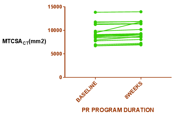 Figure 2 Difference in Mid thigh cross sectional area using CT scan (MTCSACT) in the study group before and after PR program (p= 0.0089).