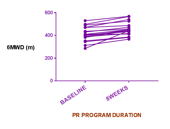 Holland28 showed that small differences in six-minute walk distance (6MWD), in the range 29–34m, may be clinically significant for people with diffuse parenchymal lung disease. In our study, the mean value of 6MWD was 411.6±15.27m. The mean value of 6MWD at the end of PR program was increased to 457.9±14.6m compared to baseline (p<0.0001). The impairment of exercise capacity is a central issue in patients with ILD patients. In clinical practice, the 6-minute walk test (6MWT) and the incremental shuttle walking test are commonly used to assess changes in functional exercise capacity following pulmonary rehabilitation with the primary outcome reported being the distance walked during the test. The 6MWT is also be used as a one-time measure of functional status of patients, as well as a predictor of morbidity and mortality in ILD patients.27