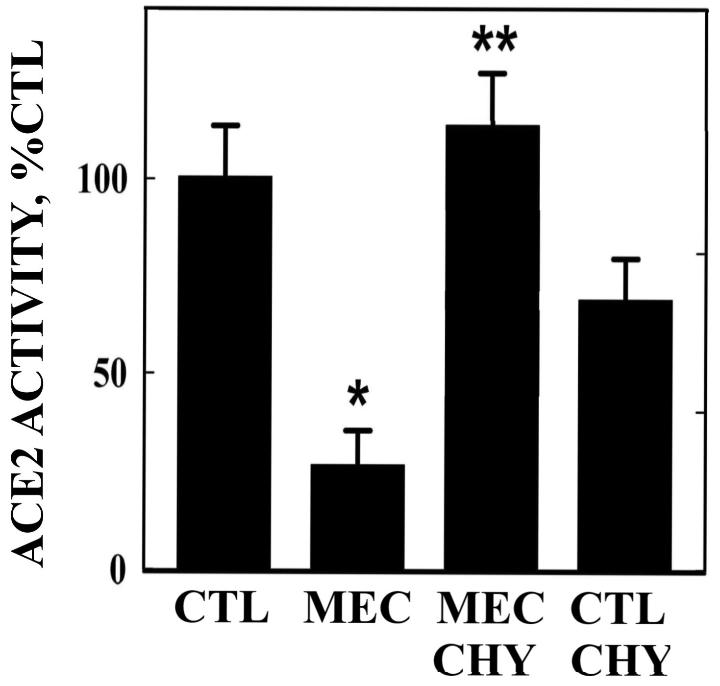 Figure 4 Protection of ACE-2 enzymatic activity from meconium-induced degradation by chymostatin. A549 cells were cultured in 2.5% meconium with and without chymostatin, AEBSF or leupeptin. Note reduction in ACE-2 enzyme activity by meconium alone (MEC), but protection by coincubation with chymostatin (CHY). AEBSF or leupeptin (not shown) had no significant protective effect on enzymatic activity.