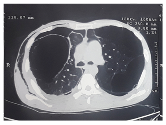 The most beneficial and precise imaging method is high resolution computerised tomography (HRCT), which should be done before surgery. Bullae are seen as avascular regions having curved edges on computed tomography.2 A large airspace in the chest could indicate a pneumothorax if the outer wall of the bullae is not seen. A double wall sign separates the two.3,4