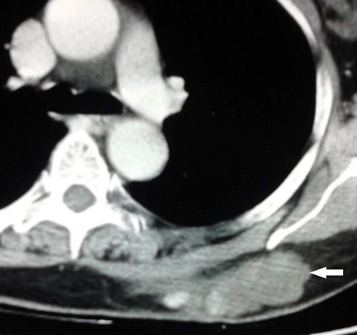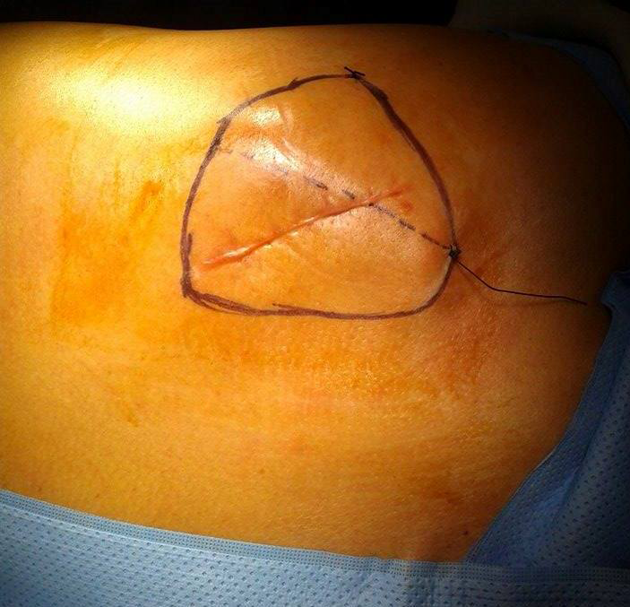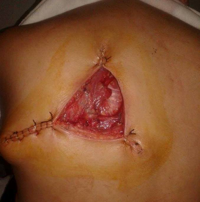This is Mrs. BK, 62years old with hypercholesterolemia on treatment who consulted in our department for a back intervertebral left shoulder swelling which has been gradually increasing in volume for 7months. Clinical examination found her in good condition with a back painless mobile mass 12cm long, without signs of skin involvement (Figure 1). This mass had both soft and hard parts with a scar from a biopsy a month ago. Thoracic CT scan (Figure 2) showed a dorsal mass with fat and solid components of 86x73x30mm extending from the posterior arches of the 4th to the 7th ribs without their invasion with an extension to the latissimus dorsi. The staging investigations based on brain, abdominal and pelvic CT scan did not show secondary location. The pathological and immunohistochemical results of the biopsy was in favor of an invasive Pleomorphic Liposarcomas grade II extending its pseudo-capsule as classified by FNCLCC. The medical file was discussed in a multidisciplinary meeting for Thoracic Oncology Group and the indication of surgical resection was made. At surgery the patient was put in a right lateral position. A circumferential peri-tumoral incision respecting a margin of 2cm was performed. A one-piece resection carrying the tumor and part of the latissimus dorsi muscle was performed with a 2cm normal tissue margin. Deep cutting of para spinal and upper margins was also performed. Skin approximation with adjacent muscles mobilization reduced the surface of the wound by 2/3 (Figure 3). Pathological findings confirmed healthy resection margins and deep tissue cuttings that were free of any tumor. A skin graft was scheduled one month later.