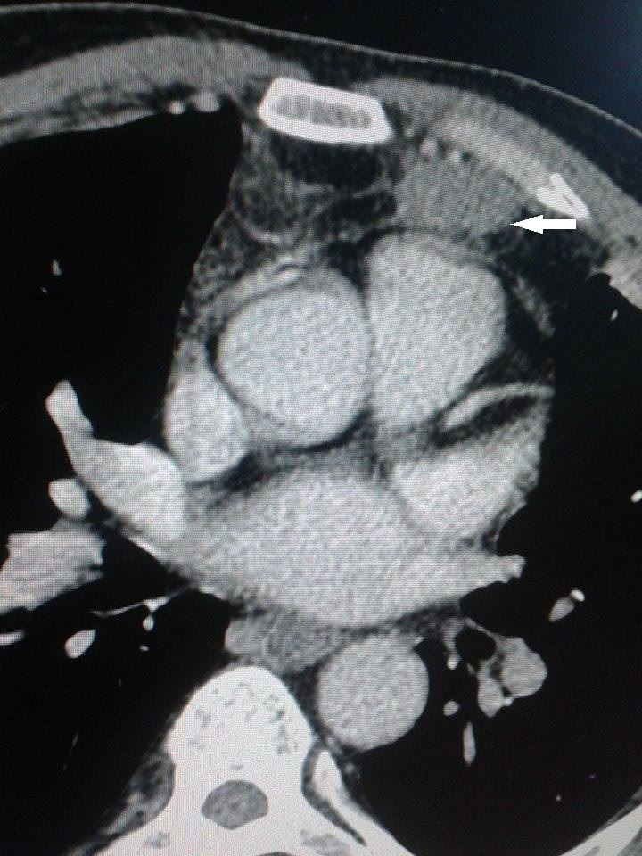 Mr BS, aged 52, had as a complaint of left para-sternal chest pain of moderate intensity without radiation. The clinical examination revealed a patient in good general condition without associated comorbidity. Chest CT scan showed an anterior mediastinal mass (Figure 4) with both tissue and fatty components of 81x75x16 mm not enhanced after contrast injection invading the pericardium and heart muscle with pericardial and bilateral pleural effusion more marked on left. CT brain, abdominal and pelvis showed no distant metastasis. Echocardiography showed a normal heart compressed anteriorly by a tissue mass. Assays of AFP and β-HCG were normal. Exploration by left parasternal mediastinoscopy was decided at first. After a 3 cm incision, exploration by mediastinoscopy showed an anterior mediastinal hard mass fixed to the pericardium. Several biopsies were performed. The pathological and immune his to chemical results were in favor of pleomorphic liposarcoma grade II according to the classification of the FNCLCC. After discussion of the Thoracic Oncology Group on medical file, indication for radiotherapy was made.
