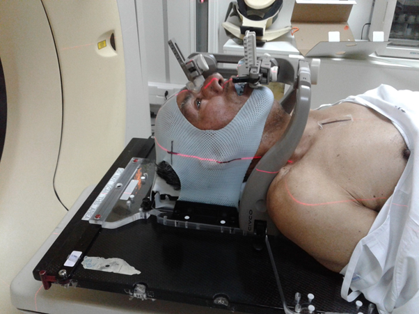 Stereotactic radiotherapy or radiosurgery is a highly sophisticated and precise technique based on the delivery of very high doses in one, or at most 5, radiation fractions, with submillimeter precision. Initially developed by the Swedish neurosurgeon Lras Leksell (1907-1986) with a machine called Gamma Knife, later techniques were developed to be able to perform it with modern linear accelerators.35,36 Initially also, used exclusively with complex stereotactic frames, it can now be done with simpler fixation instruments, what we call "frameless stereotactic mask-based approach” (Figure 2).