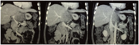The patients presented to the hospital with history of high grade fever and abdominal pain. The evaluation included blood investigation and imaging. The blood investigations revealed leucocytosis and deranged LFTs. All patients had diabetes. Ultrasonography was used as initial tool to achieve the diagnosis. In view of the location the diagnosis of liver abscess was further confirmed with contrast enhanced computerized tomography scan (CECT) of abdomen. The CECT was subsequently performed in all patients. A three dimensional reconstruction of the images was performed in all. This further helped objectively to understand the spatial orientation of abscess in relation with vascular structures.