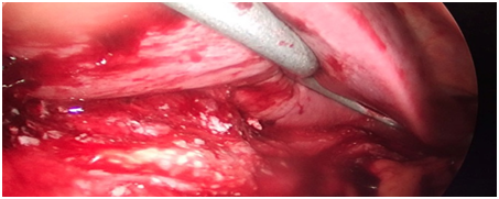 The patients were taken up for laparoscopic drainage as percutaneous approach was either not feasible (n=3) or failed (n=1). The patient was placed supine and general anesthesia was given with endotracheal intubation. Open access was used to gain access into peritoneal cavity. Three working ports were used. A Nathanson retractor was used to retract the left lobe of liver. Ports were placed in left and right hypochondrium in midclavicular line. The gastro hepatic omentum approach was followed. The location of abscess was confirmed intraoperatively with needle aspiration. The aspirate was sent for culture. Harmonic scalpel was used to enter the abscess cavity and create a wide window for drainage. The abscess was drained under vision. The cavity irrigated with copious amount of saline. An 18 F abdominal drain was placed in the abscess cavity under vision after irrigation and secured to the abdominal wall. The 10 mm port site was approximated with absorbable suture. The skin was approximated with skin clips. The intraoperative estimated blood loss was less than 100 ml in cases.