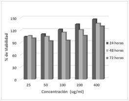With the MTT assay it was observed that for the ethanolic extract of leaves, as the concentration of the extract was increased, cell viability increased; however, by increasing the exposure time in all the concentrations evaluated, viability decreased (Figure 1). It is important to note that none of the concentrations evaluated presented a viability lower than 92%.