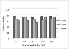 For the extract of Juice of P. edulis the behavior was different, since no significant changes were obtained in the viability percentages in the first 48 hours of treatment. However, after 72 hours, a reduction in viability was observed for the first three concentrations (25μg/ml, 50μg/ml and 100μg/ml) (Figure 2). The greatest decrease in viability at 81% was with the concentration of 100μg/ml at 72.