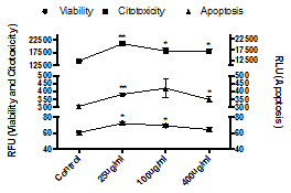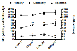 To determine the viability, cytotoxicity and apoptosis induced by the treatments, the ApoTox-GloTM Triplex Assay commercial kit (Promega) was used following the manufacturer's recommendations. For the assay, 1 x 104 cells were seeded per well, with the extracts at concentrations of 25μg/ml, 100μg/ml and 400μg/ml and incubated at 37°C for 72 hours. All measurements were made in triplicate in the Glomax multidetection system (Promega) and the results were presented as relative fluorescence units (URF) and as relative units of luminescence (URL).