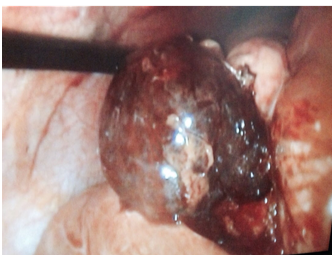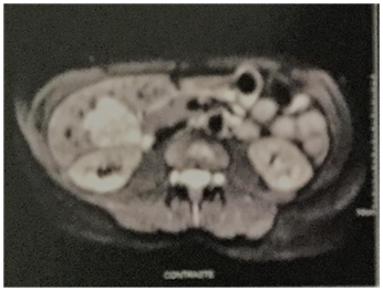 A 32year-old female was referred to us for the appearance of incidental nodular lesion into segment V of the liver. This patient has ever used neither OC’s nor AAS. She reported previous investigation of systemic arterial hypertension over last three months. She presented no familial history for SAH. Secondary arterial hypertension was exhaustively investigated, as renovascular hypertension as adrenal causes like pheochromocytoma and other lesions. All of them were excluded. Neuroendocrine tumors were also excluded since an Octreoscan was negative. Laboratory function tests were within normal limits. Hepatitis B surface, anti-HBs antibody and anti-hepatitis C virus antibody were negative. Serum tumor markers (CEA, CA 19, 9 and α-fetoprotein) were also negative. She presented only seric high levels of both renin (17,9dl/ml) and aldosterone (16,0dl/ml). She used 1500mg/day of methyldopa because she wished to make pregnant. Abdominal computer tomography (CT) showed a hypervascular heterogeneous lesion measuring 40 X 38 X 36mm and localized in V hepatic segment very close from gallbladder (Figure 1). The lesion was well defined showing dyshomogenous density with irregular enhancement in the arterial phase and wash-out in late phase. CT findings suggested hepatic adenoma. Surgical resection was indicated due risk of rupture in pregnancy. The patient was brought to the laparoscopic resection that was performed without intercurrences. A 4cm diameter of heterogeneous hemorrhagic hepatic lesion was observed in V hepatic segment (Figure 2). This lesion was enucleated and taken off by means endobag. The mass appeared as well circumscribed margins lesion with smooth external surface. The lesion was green-brown colored tumor with hemorrhagic areas. Microscopic examination showed the presence of mature, vacuolated hepatocytes; no portal or biliary structures were present, which confirmed inflammatory HA. Lesion presented hemorrhagic focus, but presented no malignant signals. Immuno-histochemistry evaluation showed IL6ST mutation which confirmed inflammatory AH. The patient stayed two days in Hospital. She recovered well without postoperative complications. Following surgery, as seric levels of both renin and aldosterone as arterial pression were decreased. After three months of surgical resection, they presented normal levels and SAH was resolved without use of anti-hypertensive drugs. At last follow-up examination at two years did not reveal the presence of any further focal lesions, and she presents well without SAH. The seric levels of both renin and aldosterone presented normal at last follow-up. This patient has used none anti-hypertensive drug.