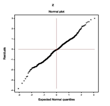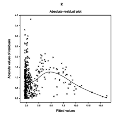 For the fitted Log-normal models (Table 1), absolute residuals are plotted with respect to fitted values in Figure 1(a), which is almost flat except the right tail. The right tail of Figure 1(a) is decreasing as the smallest absolute residual is located at the right boundary. Figure 1(a) is almost flat indicating that the variance is constant with the running means. Figure 1(b) reveals the normal probability plot of the fitted mean model in Table 1, which does not show any lack of fit due to outliers, or model selection, or distribution (Figure 1).