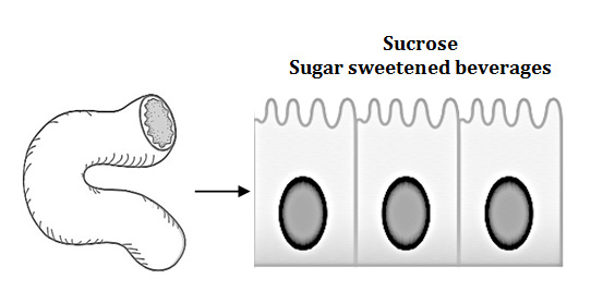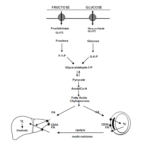 Ingestion of dietary sucrose or fructose or in sweetened beverages causes lipogenesis in the enterocyte to form fatty acids (FA), which are transported by chylomicrons to the liver and adipose tissue; however, the lipolysis of adipocyte during insulin resistance releases FA that are carried to hepatic tissue and are introduced in hepatocyte through CD36 receptor; these events are closely related to the formation of hepatic steatosis and development of Non-Alcoholic Fatty Liver Disease (NAFLD).
