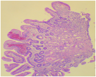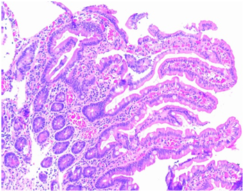 Figure 1 Pathology results in case 2. Coeliac disease. Small duodenal biopsy in case 2. Panoramic view of endoscopy duodenal biopsies with height shortening and widening of some duodenal villi. Lamina propria with lymphocites and plasmatic cells. Marsh 3B.