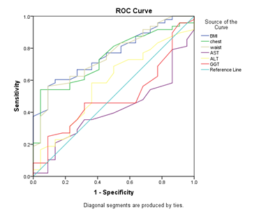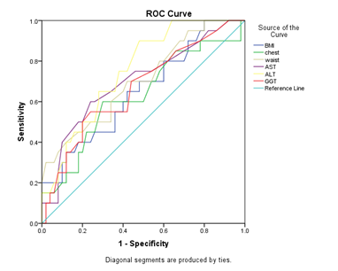 Figure1 Receiver operating characteristic curves (ROC) of anthropometric parameters and serum liver function tests in predicting hepatic steatosis.