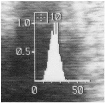 The clinical tissue characterization was achieved by gray level histogram width divided by full gray scale length Figure 1,2,3 of which value was called gray level histogram width (GLHW), which was standardized by studying RMI 412 phantom (Radiation Measurement Inc. Middleton, Wisconsin), of which histogram width did not change when the B-mode device gain controled, while image contrast had to be lowest, because histogram width was enlarged when the image contrast was high. The GLHW. of RMI 412 phantom was studied to be standardized in various Aloka machines (Aloka, Tokyo) and Voluson 530D (GE Healthcare)., The GLHW was manually calculated, and also automatically calculated by “%W” index in the histogram of Aloka B-mode devices (Tokyo), where the value was the same as manual determination.3