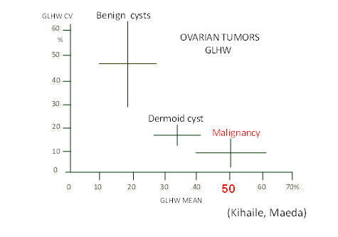 GLHW in preoperative ovarian masses were compared to postoperative pathology in benign and malignant tumors,4 where mean GLHW was 18±10 % in benign masses, while it was 51±11 % in malignancy, and mean GLHW values were larger in malignant masses than benign tumors Figure 2,4 and therefore, ovarian malignant neoplasia is diagnosed by GLHW. Ovarian dermoid cyst was intermediate between benign and malignant masses, however, a dermoid cyst is diagnosed by its characteristic B-mode image, which is the niveau formation.