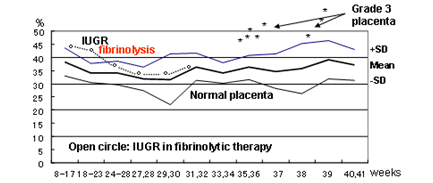 Figure 4 Repeated GLHWs of a FGR (open circles) were compared to normal placental GLHW (Mean±1.5SD). High GLHW of the FGR placenta decreased to normal level by the heparin treatment, which soluted fibrin, where estimated fetal weight increased to normal level, then normal neonate was born.