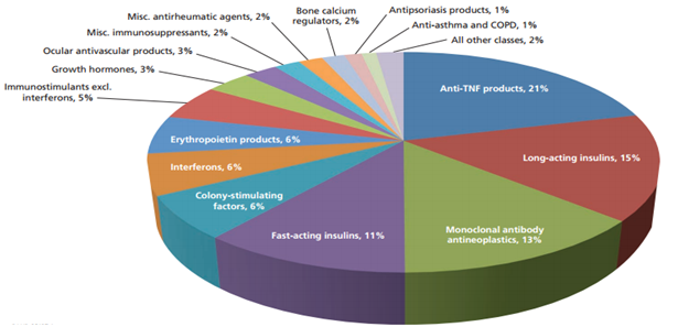Pie Chart compiled by Rand Corporation using data on more than 100 biologics, including all blockbuster biologics with sales over $1 billion and many products with smaller markets to estimate the potential direct cost savings from biosimilars.13