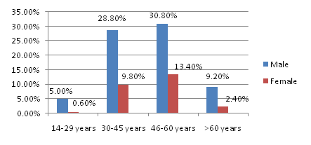 Figure 1 shows the age wise distribution of respondents. It was found that the disease is more prevalent in the age group of 46-60 years (30.8% were males and 13.4% were females) followed by the age group of 30-45 years (28.8% were males & 9.8% were females) Table 3.