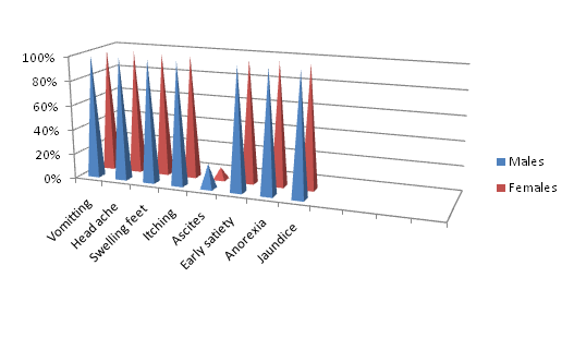 Careful perusal of the Figure 2 shows that all the studied respondents, both male and female had presence of all signs and symptoms of liver cirrhosis except ascites which was present only in 20% male respondents and 10% female respondents.
