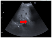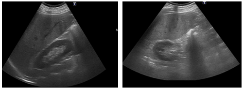Figure 1 Diffuse hepatic parenchymal echogenicity alteration, non-dilated bile ducts and collapsed gallbladder. Normal pancreas and spleen without free peritoneal fluid.