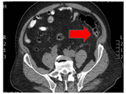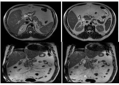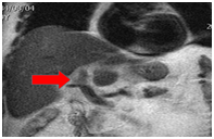 A 75-year-old male patient presents with a clinical picture of 4days of fever, LIF abdominal pain and jaundice. Clinical history was positive for a laparoscopic gallbladder removal. The patient had a BP of 85/60mmHg, HR of 91bpm, RR of 22rpm, temperature of 38.2, jaundice without peritoneal irritation. Significant lab findings included thrombocytopenia of 82.000, Creatinine of 2.62, Total bilirubin of 4.3 Direct bilirubin of 3.5 indirect bilirubin of 0.8, Alkaline phosphatase of 161, normal liver enzymes, and ABGs showing metabolic acidosis. The initial proposed diagnosis was an intra-abdominal septic shock. ICU managed included Noradrenalin, IV fluids, broad-spectrum antibiotics with Meropenem and Linezolid. Initial Contrast abdominal CT showed a sigmoidal Hinchey 1A diverticulitis (Figure 5). Abdominal ultrasound showing a normal bile duct (Figure 6). Follow-up abdominal CT showing sigmoidal Hinchey 1B diverticulitis (microperforation), left intrahepatic portal vein thrombosis (Figure 7). Bile system MRI showing a common bile duct of 7.2mm (Figure 8). Despite treatment the patient had persistent bilirubin elevation of up to 11 mg/dl and a blood culture positive for a resistant E.coli. The patient was taken to a diagnostic laparoscopy finding a sigmoid diverticulitis with a plastron of pericolic fat tissue. A laparotomy incision was performed finding significant venous thrombosis of the left colic vein and sigmoid vein requiring a left colectomy with a Hartmann colostomy. Pathology report confirmed venous thrombosis. The patient had full recovery with antibiotics and was discharged.