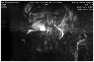 Upper endoscopy was done with normal results. Magnetic Resonance Cholangiopancreatography (MRCP) was done with the result of periportal and pericholecystic edema and decreased intrahepatic bile ducts diameter due to parenchymal hepatic edema. The other parts were normal according to the report (Figure 1).