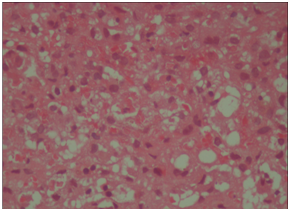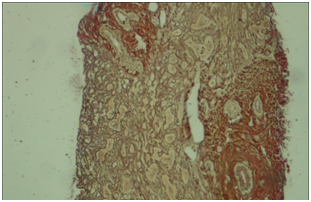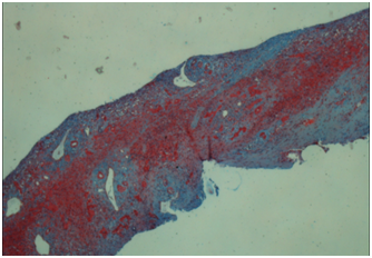 Finally, liver biopsy was done .The sample was stained with Hematoxylin, and Eosin, Trichrome and Reticulin. Extensive lobular architecture disarray with marked necro-inflammatory changes of parenchyma characterized by obvious hydropic changes and single cell necrosis of hepatocytes as well as infiltration of mixed inflammatory cells was shown in Hematoxylin, and Eosin staining (Figure 2). Collapse of reticulin network associated with psuedolobule formation as well as portal fibrosis was shown in Reticulin and Masson-Trichrome staining (Figures 3&4). Overall findings were in favour of an acute/sub acute liver injury according to Modified HAI score grade: 14/18, stage: 3/6.