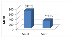 Mean value of SGOT was significantly higher than SGPT (Figure 1). Majority of patients had their SGOT values between 3 to 10 times upper limit of normal (45.6%) while for SGPT majority values were between 1 to 3 times upper limit of normal (Table 2). In contrast to SGOT/SGPT, a scanty number of patients had elevation in Bilirubin. 10 patients (3.6%) had elevation in Bilirubin more than 3mg/dl. 28 patients (10%) had evidence of coagulopathy (INR>1.5) and 6 patients were found to have hepatic encephalopathy. Almost 4/5th of patients (79.4%) had platelet counts <1 lakh at some point of time during hospital stay. A meagre percentage (2.1%) had leukocytosis, while rest had either normal TLC or leucopenia. Comparison of laboratory parameters was done between male and female patients (Table 3). Also Comparison of various liver function tests was done between DF, DHF (Table 4).