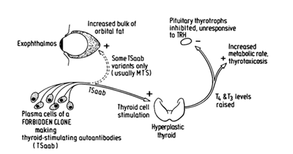 Auto-antibodies perpetuate the synthesis and exercise of sodium/iodide symporter (a protein located in the baso-lateral membrane of the thyrocytes) with an enhanced iodine uptake and a deficiency of TSH receptor which mobilizes protein C kinase pathway to control cell proliferation. Pituitary secretion of TSH is restricted with the antagonistic feedback mechanism of the accumulated thyroid hormones. A collective immune execution is implicated in the pathogenesis (Figure 1).<Probable immune aetiology of graves’ disease7