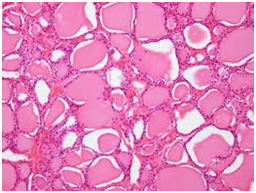 Additional features are a patchy, variable stromal lymphoid infiltrate. Post therapy colloid accumulation shows peripheral scalloping. Per operative potassium iodide utilized to clamp blood vessels incites epithelial involution with abundant colloid. Per-operative propylthiouracil elicits a florid follicular hyperplasia/hypertrophy. Radioactive iodine initiates dissolution of some follicles, vascular changes, nuclear atypia and stromal fibrosis. Follicular atrophy, fibrosis, nodular architecture and oncocytic change are visualized subsequently. Lympho-plasmacytic infiltrate of the peri-orbital soft tissue and extra-orbital skeletal muscle is perceived. Hyperkeratosis and deposition of acid muco-polysaccharides occurs in the dermis (Figures 2-5) (Table 1).