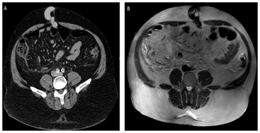 Figure 1 In A, Axial CT scans with contrast and in B, MRI without contrast in the axial T2 plane shows recanalization of paraumbilical vein insinuating through the umbilical hernia.