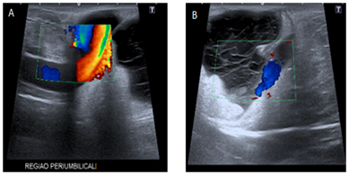 Umbilical hernias are common in patients with chronic liver disease, caused by increased intra-abdominal pressure. In some patients the hernia contents can be the dilated paraumbilical vein.6Complications are ulceration of the skin and vascular rupture, with high mortality. It can also occur thrombosis of paraumbilical herniated vein. Imaging tests are essential for the diagnosis of the contents of the sac in order to assist the treatment.6