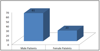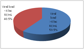 A total of 84 patients were included in the study. Male patients dominated in the study group [61 male (72.6%) & 23 females (27.3%)] (Figure 1). 38 patients (45.2%) belonged to <40 yrs age group while 46 (54.7%) patients were >40 yrs of age. Genotype 3 was the most common genotype detected in our patients [59 (70.2%)] followed by genotype 1 [20 (23.8%)] and genotype 4 patient [5 (5.9%)] (Figure 2). Majority of patients [50 (59.5%)] had viral load >6 lac IU/mL while the remaining 34 (40.5%) patients had <6 lakh HCV RNA IU/mL (Figure 3). HCV RNA was undetected at 4th week in 78 (92.85%) while ETVR was seen in 80 (95.23%) patients. SVR at 12th week was seen in 73 (86.90 %) patients, 6 patients were LFU while 5 did not achieve SVR.