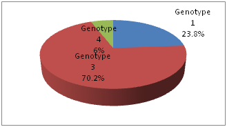 In India, it has been reported in many studies that genotype 3 is the predominant genotype among all. Though a study of Valliammai T et al.10 from south India has reported Genotype 1 as the commonest cause whereas study of Chakravarti A et al.11 from North India invariably concluded genotype 3 to be the commonest. In our study too, genotype 3 was the commonest followed by genotype 1 and 4 respectively.