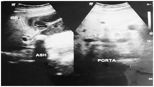 On examination, abdomen was tender and distended with guarding in right hypochondrium (RHC). Soft to firm globular swelling was palpable in RHC which was tender. No other obvious findings were noticed. His pulse rate was 87/min, blood pressure in lying posture was 132/82 mmHg, respiratory rate was 20/min, oral temperature was 98.60F, SPO2 was 99% in room air. Other systemic examinations were normal. Ultrasonography of abdomen revealed features suggestive of chronic cholecystitis with cholelithiasis with thickened gallbladder (~8mm) (Figure 1). Common bile duct was of normal caliber with no echogenic shadow within it. Other abdominal organs were within normal range. Chest X-ray and ECG were also normal. The leukocytosis (13900/cumm) with neutrophilia (86%) was present. Other biochemistry and serology investigations were within normal range. On the basis of history and clinical findings, patient was diagnosed as a case of acute or chronic cholecystitis with cholelithiasis.