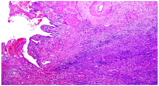 Under general anesthesia, laparoscopic cholecystectomy was planned. Patient was kept supine and standard four ports were introduced. Initial examination of abdomen revealed dense adhesions around the gallbladder. Adhesiolysis was tried but failed as bowel was firmly adhered to the GB and GB wall was very fragile, therefore, conversion was decided. Patient was then opened through right Kocher’s incision. After entering the abdomen, meticulous adhesiolysis was again performed, during which GB got opened and thick blood mixed pus came out. All the pus was aspirated and stones were removed thoroughly. GB lumen was irrigated with normal saline several times to takeout any residual stone. After that, all the bowel adhesions were removed by blunt and sharp dissection. Gallbladder was removed from the liver bed up to the neck and then subtotal cholecystectomy was done as anatomy of Calot’s triangle was obscure. Dissection area was thoroughly washed with Luke warm normal saline. 18 Fr abdominal drains were put near the GB fossa and abdomen was then closed in layers. Patient was extubated on table. GB specimen was sent for histopathology examination. No intraoperative complication noticed.