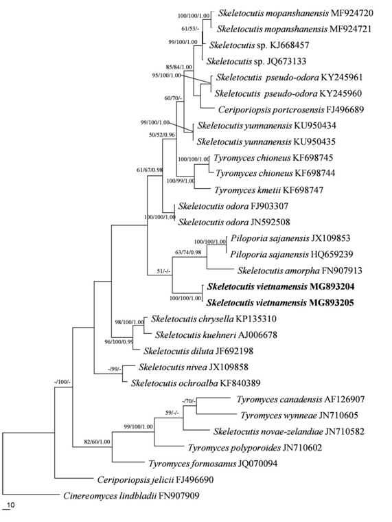 Figure 1 Maximum Parsimony strict consensus tree illustrating the phylogeny of Skeletocutis vietnamensis and related species based on the combined dataset (ITS). Branches are labeled with maximum likelihood bootstrap higher than 50%, parsimony bootstrap proportions higher than 50% and Bayesian posterior probabilities more than 0.95 respectively. The newly sequenced specimens are labeled in boldface.