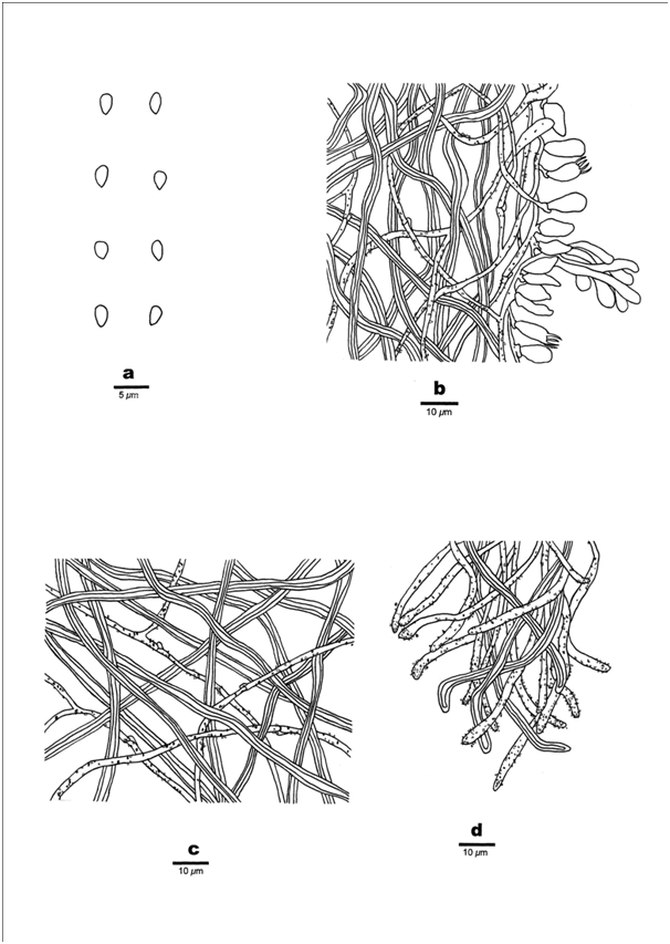 Context –Generative hyphae frequent, hyaline, thin- to slightly thick-walled, rarely branched and bearing fine crystals, 1.5–2.5μm in diameter; skeletal hyphae in trama dominant, thick-walled, flexuous, unbranched, interwoven, 2–3μm in diameter.