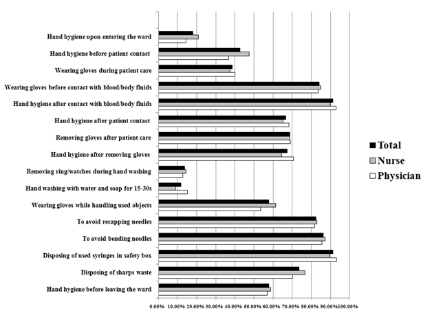 Also, it was found that there is no correlation between work experience and score of knowledge and attitude of physicians and nurses. Table 3 shows this comparison. Finally, the percentages of good practice for nurses and physicians were assessed in each of 16 opportunities. The comparison between two groups in terms of occupation also showed that they were not significantly different (Figure 1).