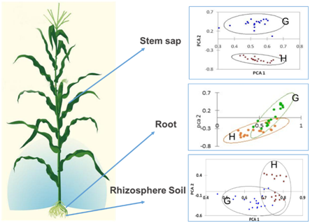 Figure 2 Bacterial communities of corn rhizosphere soil, root and sap samples at 60 Days after planting from high and low productive sites. Principal Component Analysis plots were constructed using the Terminal Restriction Fragment Length Polymorphism profiles (Islam et al.5 Unpublished data).