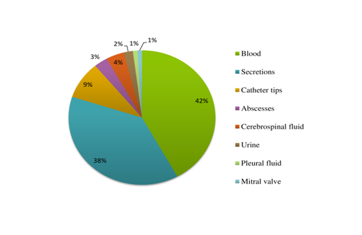Concerning the source of the isolates, the majority was from blood cultures and secretions (Figure 2). Obtaining 42% of the isolates in blood samples is alarming because S. aureus bacteremia is associated with high case fatality (20-30%).19 All the isolates were penicillin-resistant and sensible to vancomycin, quinupristin/dalfopristin and linezolid (Table 1). The prevalence of MRSA, oxacillin/methicillin resistant, was of 30% and most of the isolates were resistant to multiple antibiotics, which mean they were able to counteract different mechanisms of action (from cell wall synthesis to DNA topoisomerase inhibition). Four of them were resistant to at least seven antibiotics (oxacillin, penicillin, clindamycin, erythromycin, sulfamethoxazole/trimethoprim, rifampicin and norfloxacin). Resistance to erythromycin, sulfamethoxazole-trimethoprim and clindamycin reached 58%, 43% and 28%, respectively. Particularly among the MRSA, the prevalence of resistant to those antibiotics was very elevate (87%, 83% and 60%, respectively) in comparison to the rates reported in previous studies.20-22 Nowadays, it is common to see such resistance profiles, especially against clindamycin, due to haphazard use of these antibiotics.22