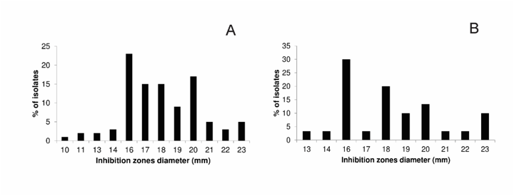 Figure 3 Inhibition zones diameters produced by dactylomelin-P against S. aureus clinical isolates (A) and MRSA strains (B).