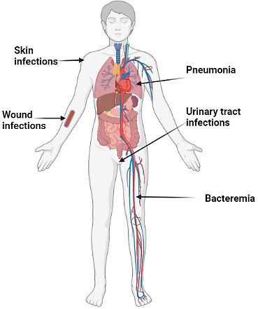 To date, there are around 50 Acinetobacter species, the vast majority of which are nonpathogenic; nevertheless, only a few species are opportunistic human infections. The most clinically important species of the Acinetobacter genus are Acinetobacter calcoaceticus and Acinetobacter baumannii.16 Natural reservoirs of these pathogens outside hospitals are not yet known.17 A. baumannii causes a variety of diseases in both hospitals (nosocomial) and the general public, including skin and soft tissue infections, bacteremia, meningitis, pneumonia and urinary tract infections (Figure 1).18 Regretfully, about 2% of all health-care-associated infections caused in the United States and Europe are from A. baumannii, and it is expected to be much higher in Asia, where around 45% of A. baumannii isolates are classified as multidrug-resistant (MDR) pathogen and this percentage is anticipated to be as high as 70% in the Middle East and Latin America.19-21 Due to various outbreaks occurred by MDR A. baumannii infections, the WHO has declared that A. baumannii is one of the most serious resistant pathogens that successfully evade the action of most available antibiotics.22 Resistance mechanisms in A. baumannii include beta-lactamases, efflux pumps, aminoglycoside-modifying enzymes, target site alterations, and permeability deficiencies. Internationally, the proportion of Acinetobacter spp. causing pneumonia in the Intensive care units (ICU) in the United States grew from 1.4 % in 1975 to 6.9% in 2003.23 In China, the imipenem-resistant A. baumannii of has spread dramatically in Western China in 2011.24 In Latin America, an outbreak of an MDR A. baumannii strain has been documented initially in 2011 in the ICU that lasted until 2015.25 While A. baumannii outbreaks have been documented in various parts of the world, there are limited data from Africa. In Nairobi, Kenya, an outbreak of MDR A. baumannii strains was reported between September 2010 and September 2011.26 Then, came the Covid-19 pandemic and the health authorities have taken up the fight against it and this led to a decrease in surveillance studies on the prevalence of A. baumannii infections worldwide. However, in a Covid-19 devoted hospital, there was an outbreak of carbapenem-resistant A. baumannii. The hands or equipment of healthcare personnel were suspected as the means of transmission.27 This outbreak shows that during the COVID-19 pandemic, procedures to limit the spread of MDR A. baumannii must not be overlooked.