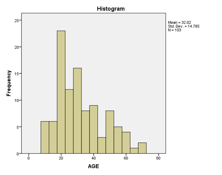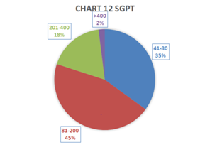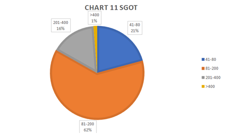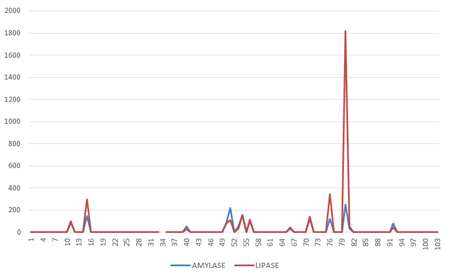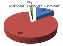 In this study, total 103 dengue MAC ELISA positive or Dengue NS1Ag ELISA positive (Tested as per day of fever according to NVBDCP guidelines) or both patients were included and analyzed. If the patient presented within 5 days of fever NS1 Ag was tested and irrespective of results Dengue IgM was tested after 5 days of fever during treatment. But those who presented late only Dengue IgM was tested. Among a total of 103 patients, 61(59%) were male and 42(41%) female (Figure 1). Mean age of the patients was 32.02±14.875 (Figure 2). Most of the patients were from urban (85%) and the remainder from rural areas and semi-urban areas (Figure 3). Amongst clinical manifestations most of the patients had myalgia (85.4%), followed by rash (56.3%) and vomiting (37.9%). However only 24.3% of patients had arthralgia (Figure 4). Gastrointestinal symptoms were present in the form of diarrhea and abdominal pain 9.7% each (Figure 4). In 37% of patients there were bleeding manifestations (Figure 5). Patients with bleeding manifestations purpuric spots was in the majority (10%), hematuria, gum bleeding were 6% each, PV bleeding was 8 % and sub-conjunctival hemorrhage was 5% (Figure 5). 21% of the patients had plasma leakage (Figure 6). And amongst who had leakage were 8% for pleural effusion, 5% were having ascites and 8% were having both pleural effusion and ascites (Figure 6). Only 13% patients had hypotension which was corrected by only volume replacement in 9% patients (Figure 7). 40% of patients had organomegaly and hepatomegaly amongst them 27% had hepatomegaly and only small proportion (2.9%) had lymphadenopathy (Figure 8). In Liver function tests 85.43% patients had raised (>1xULN) SGOT, 67.86% had raised SGPT (>1 x ULN) and only minority (1.9%) had raised bilirubin level (more than 1mg/dl) (Figure 9). SGOT>SGPT were present in 86(83%) patients (Figure 10). In analysis of SGOT 2-5-fold elevation was common (62%), 1-2-fold elevation was only 16% (Figure 11). But in analysis of SGPT 2-5-fold elevation was 45% and 1-2-fold elevation was 35% (Figure 12). In the study population 42 (41%) patients were Dengue IgM reactive, 24 (23%) patients were Dengue NS1 Ag reactive and 36 (35%) patients were both reactive (Figure 13). Only 11% patients required platelet transfusion (Figure 14). Amongst them gum bleeding was the most common (46%) indication followed by PV bleeding (27%) and for low platelet count (<10,000/cm) 18% were transfused (Figure 14). Platelet values and days counted from the onset of fever were followed. But at which day of fever platelet count falls and when it rises has no specific pattern (Figure 15). Only 14 patients (13.4%) had pancreatic involvement (Figure 16) in course of the illness and lipase elevation (>4x ULN) was more than amylase in all cases (Figure 17 & 18).
