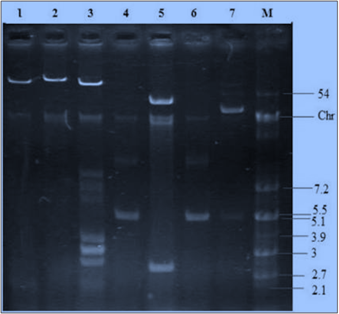 Plasmids were extracted following the method described by Zhou et al.19 Briefly, cell pellets were obtained from 5 ml of an overnight bacteria broth by centrifugation at 13,000 rpm for 1 min in a centrifuge (Eppendorf 5418, Germany). Pellets were re-suspended in residual supernatant (≈50μl) by vortexing, and 300μl of TENS (25 mM Tris, 10 mM EDTA, 0.1 N NaOH and 0.5% SDS) added and mixed by inverting tubes about 3-5 times. Subsequently, 150μl of 3 M sodium acetate (pH 5.2) was added, vortexed thoroughly, and centrifuged for 5 min to pellet cell debris and chromosomal DNA. Clear supernatant was then carefully transferred into a new 1.5 ml micro centrifuge tube, mixed thoroughly with 900μl of ice cold absolute ethanol, and centrifuged for 10 min to pellet down. Pellets were further washed with 1ml of cold 70% ethanol, air dried and re-suspended in 20μl of TE buffer (10mM Tris-CL, pH 7.5; 1 mM EDTA). The integrity of the re-suspended pellets (plasmids) was verified on 1% agarose gel electrophoresis.