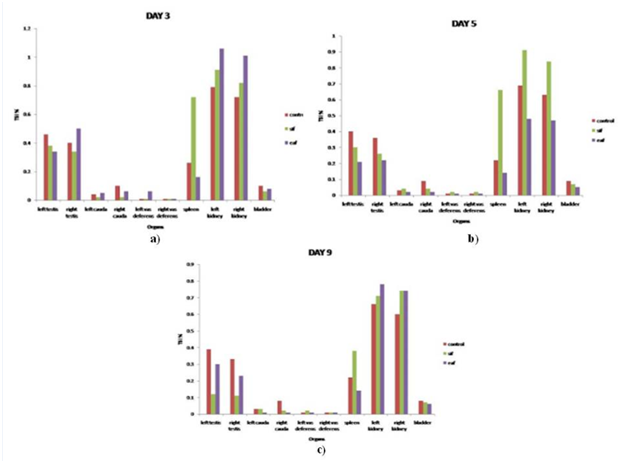 When TSI (%) of various reproductive (testes, cauda and vas deferens) and non-reproductive (spleen, kidney and bladder) organs was examined, it was found that there were no treatment-related changes in the absolute weights of all the organs, except spleen and vas deferens in case of SIF where a significant increase in weight was observed on all the 3 days. However, right cauda showed marked decrease in TSI on all the 3 days and testes showed a marked decrease in TSI on day 9 only. Further, in the case of SAF treated group, left vas deferens showed a considerable increase in TSI on day 3 while the right cauda epididymis showed a significant reduction on days 5 and 9 (Figure 1). The evaluation revealed that no clear pattern could be obtained, hence, reliance on more sensitive end points such as morphological and functional abnormalities of these organs could be helpful to better delineate the alterations.