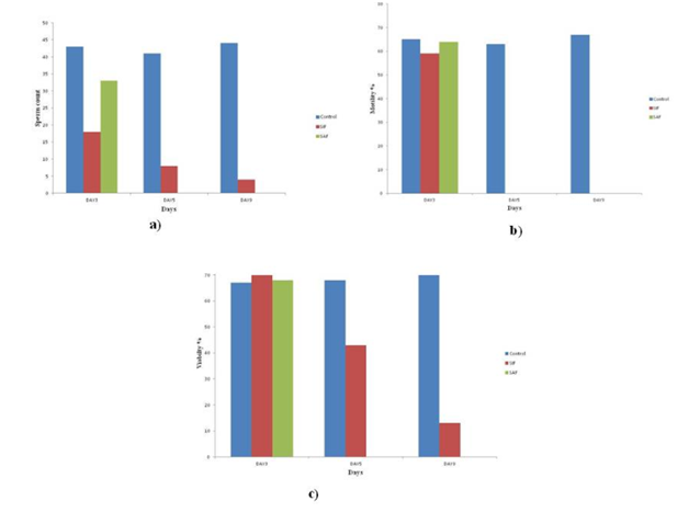 Figure 2 Total sperm count (a), % motility (b), % viability (c) of male mice after 3, 5 and 9 days of treatment with SIF/SAF.