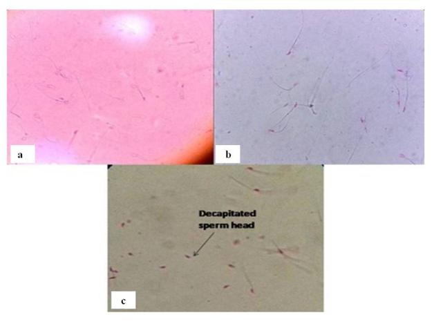 Figure 3 Representative photomicrographs of a) control group showing viable unstained spermatozoa; b) SIF/SAF treated group showing pink stained dead spermatozoa and c) presence of decapitated sperm heads on treatment with SIF